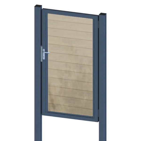 Křídlové brány HoriZen se skládají z jednoho nebo dvou křídel, 2 sloupků a příslušenství. WPC desky se snadno zasunou do slotů rámu.